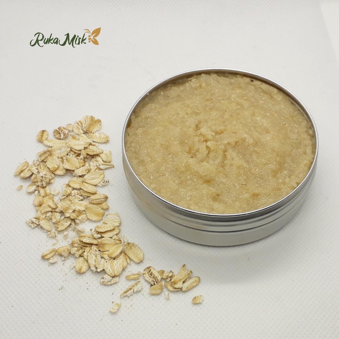Ingredientes: Azúcar, Avena, Aceite de almendras, Emulpharma, Miel, Manteca de karité, Manteca de cacao, Cera de abejas, Extracto de Manzanilla, Aceite de Avellana chilena, Aceite de Coco, Colágeno, Esencia de almendras, Vitamina E