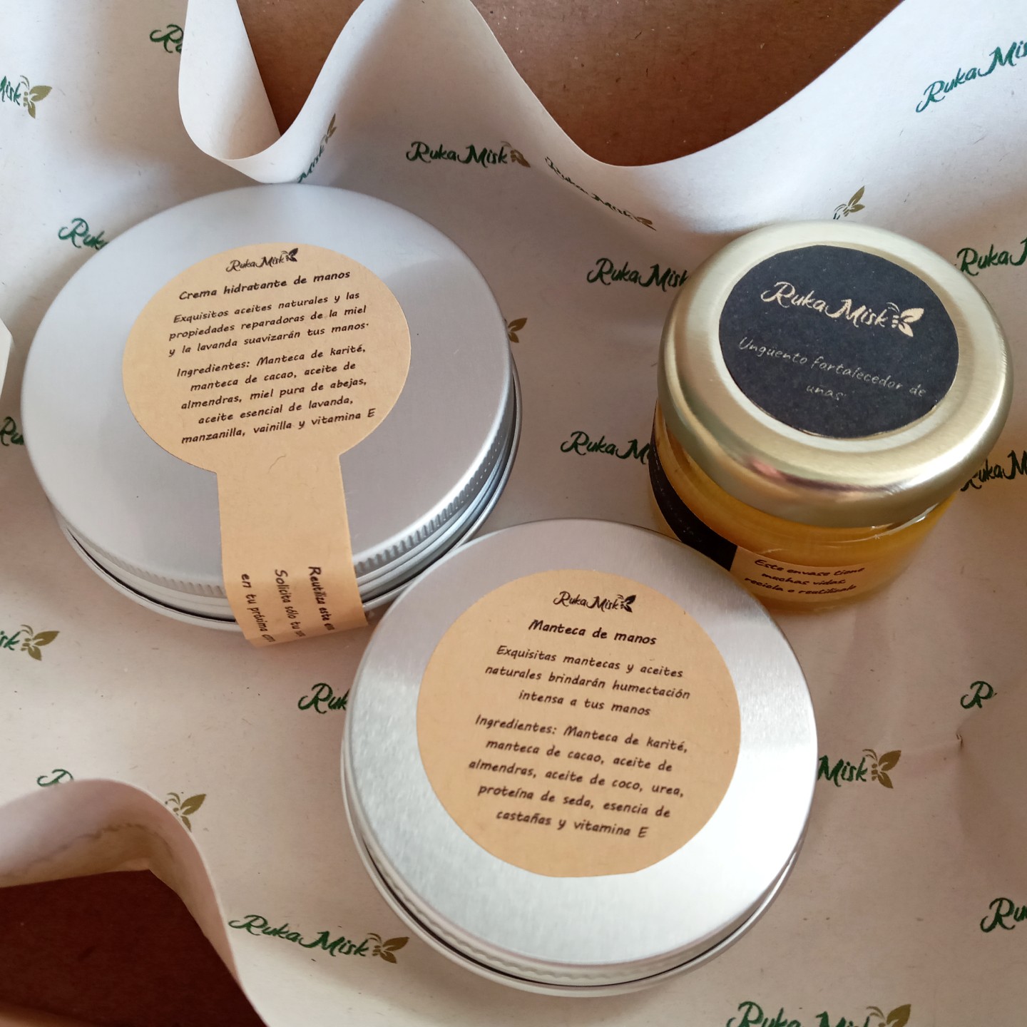 Todos los productos contienen mantecas y aceites naturales, sin siliconas ni derivados del petróleo.